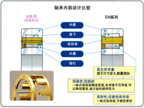 skf原先提供的以下兩種單列skf圓柱滾子軸承的標(biāo)準(zhǔn)保持架,標(biāo)準(zhǔn)車削保持架型套圈引導(dǎo)型分離式銅合金保持架)高負(fù)荷容量E型(套圈引導(dǎo)型-體式銅合金保持架)。現(xiàn)在,skf開發(fā)了21世紀(jì)的銅合金一體式保持架的圓柱滾子軸承。EM系列軸承兼具以上兩種軸承的優(yōu)點(diǎn),并進(jìn)一步提高了性能。skf基于新的設(shè)計(jì)理念而開發(fā)的全新構(gòu)造軸承。無論在性能還是壽命上,都具有較強(qiáng)的特性,是新時(shí)代的高負(fù)荷容量圓柱滾子軸承。