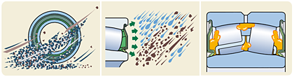 密封件嵌入外圈的凹槽。在小型軸承中,密封件壓入凹槽;而在大型軸承中,密封件使用扣環定位。密封件有兩個密封唇,在內圈滾道兩側同導入槽接觸,提供有效的密封。